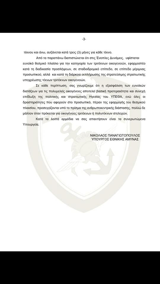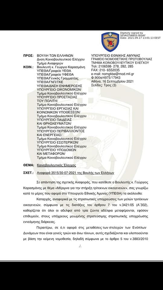 Μετά από την υπ αριθ. Πρωτ. 97/ 24-7-2021 επιστολή διαμαρτυρίας που έστειλε η ΟΠΟΤΤΕ (ΟΜΟΣΠΟΝΔΙΑ ΠΟΛΥΜΕΛΩΝ ΟΙΚΟΓΕΝΕΙΩΝ ΜΕ ΤΡΙΑ ΤΕΚΝΑ ΕΛΛΑΔΟΣ ) σε όλα τα Υπουργεία και Βουλευτές, Κόματα με θέματα για τις τρίτεκνες -πολυμελείς οικογένειες , ο Βουλευτής Καρασμάνης Γεώργιος μας γνωστοποίησε την επιστολή του Υπουργείου Εθνικής Αμύνης